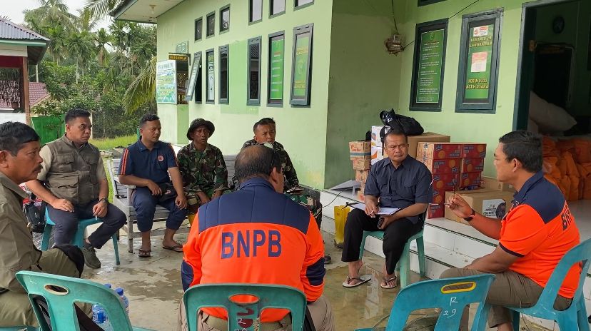 Foto 2: Deputi Bidang Penanganan Darurat BNPB, Mayjen TNI Budi Irawan (kanan) berkoordinasi dengan petugas di Koramil di Langkahan, Aceh Utara.