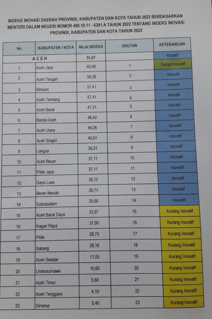 Skor tersebut berdasarkan penilaian dari Kementerian Dalam Negeri (Kemendagri) melalui Radiogram Penyampaian Indeks Inovasi Daerah Provinsi, Kabupaten dan Kota Tahun 2022.