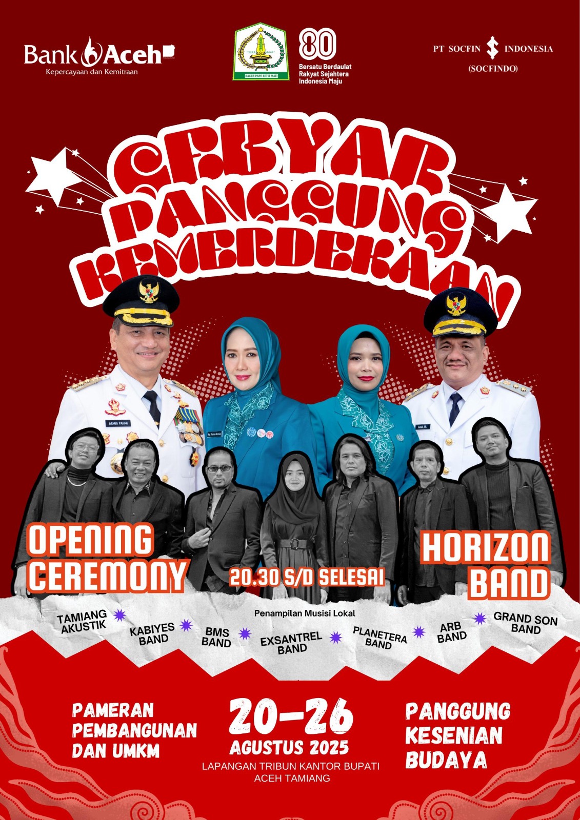 “Kepada masyarakat, jangan lupa hadir dan kita meriahkan gebyar panggung kemerdekaan ini. Kita kenalkan budaya kita dan kita dukung produk inovatif hasil karya pelaku usaha daerah kita,” ucap Bupati Armia.