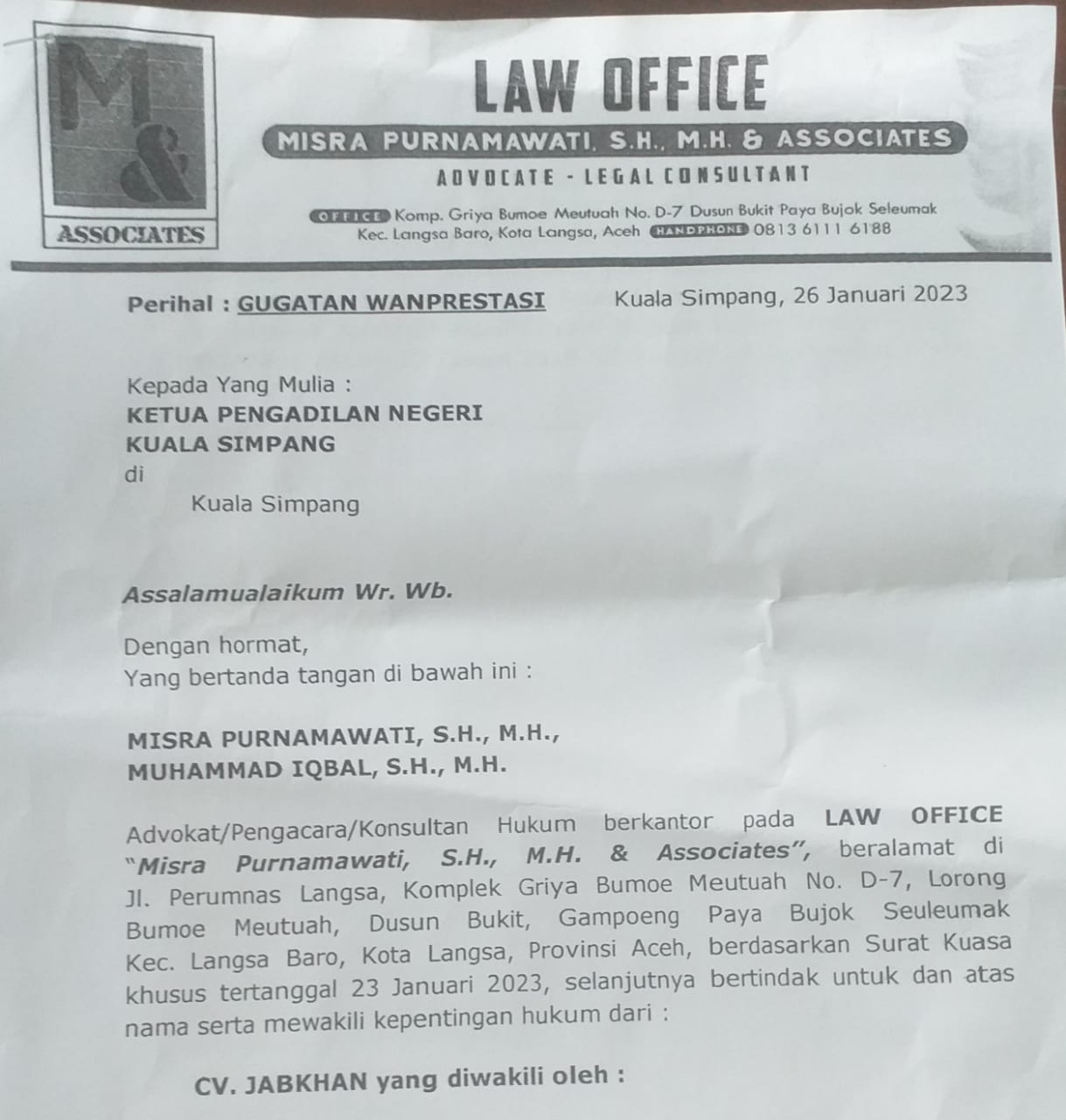 CV. Jabkhan, melalui kuasa hukumnya Misra Purnamawati, S.H., M.H. dan Muhammad Iqbal, SH M.H, Selasa (7/3) kepada beritasore.co.id mengatakan, pihak Pengadilan Negeri Kualasimpang telah menyampaikan undangan jadwal sidang gugatan tersebut pada tanggal 30 Januari 2023 lalu.