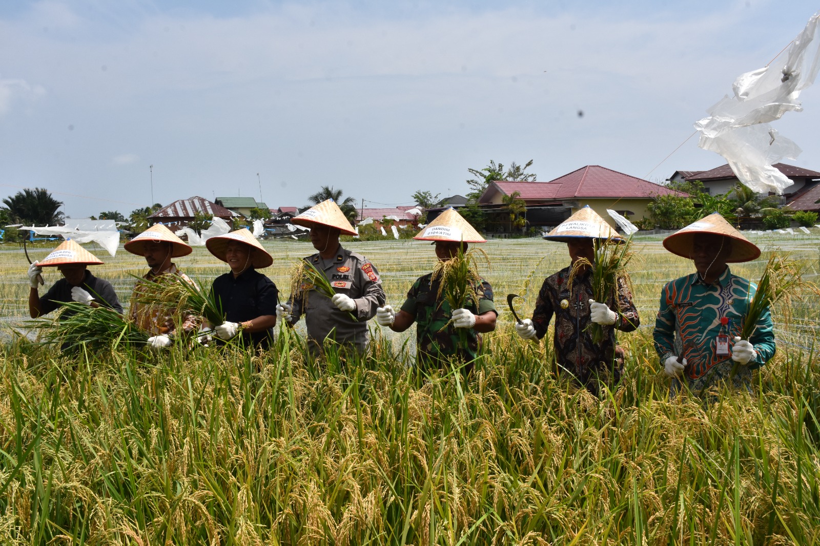 Langsa (Berita) : Pj. Walikota Langsa Syaridin, S.Pd, M.Pd melakukan Panen Perdana Padi Program Ketahanan Pangan Gampong (Desa) Matang Seulimeng, Kecamatan Langsa Barat, Kota Langsa, Kamis (21/3/2024).