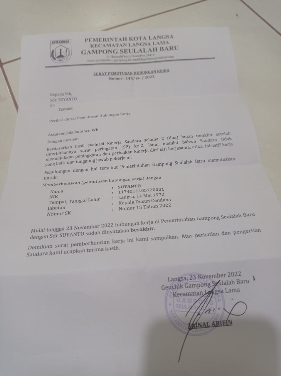 Sementara Geuchik Selamat Baru Jainal Arifin yang dikonfirmasi Berita Melalui Telpon seluler nya terkait pemecatan Suyanto mengatakan Di dalam surat pemutusan kerja sudah tertulis. Jawabnya singkat. ( epa)