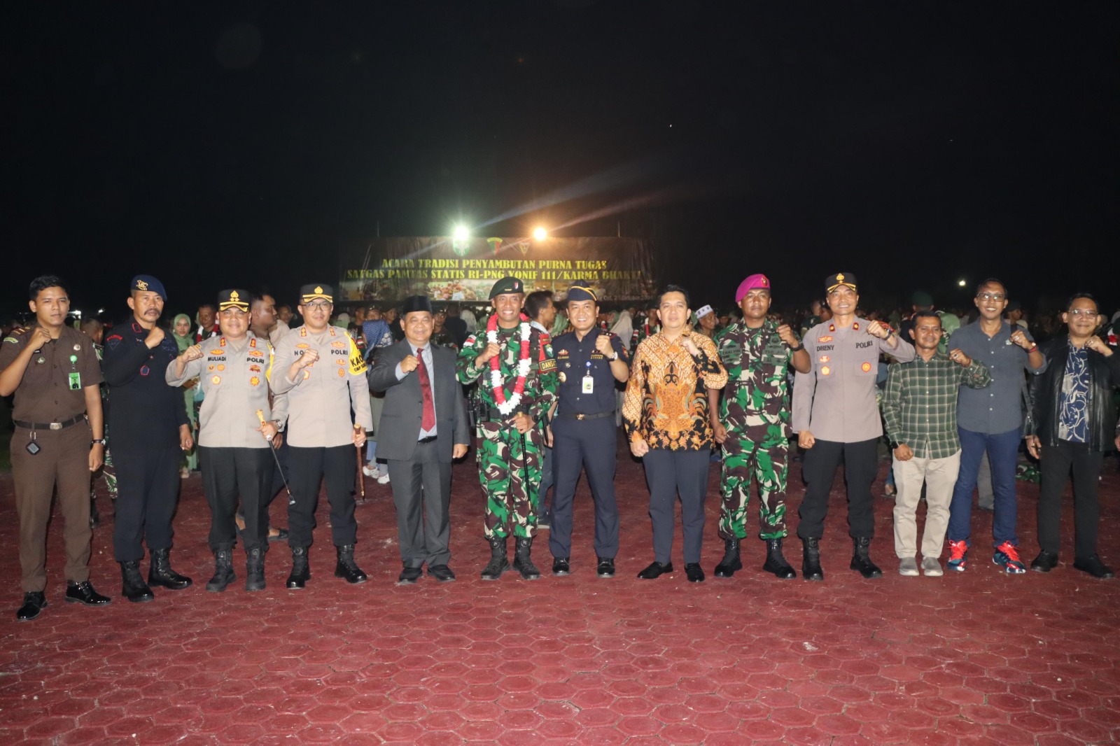 KUALASIMPANG (Berita): Kapolres Aceh Tamiang AKBP Muliadi, SH, MH menghadiri acara tradisi penyambutan purna tugas Satgas Pamtas Statis RI – PNG di Batalyon Infanteri Raider Khusus 111/Karma Bhakti, Tualang Cut, Kecamatan Manyak Payed, Senin (21/10/2024) malam.