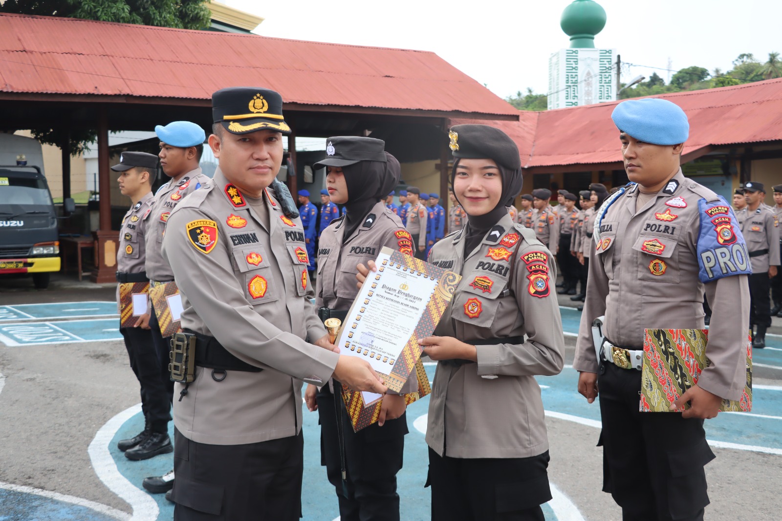Usai upacara Kapolres Sabang, AKBP Erwan, SH, MH, menyerahkan piagam penghargaan kepada personil Polres Sabang yang mengikuti dan yang meraih prestasi gemilang pada Kejuaraan Pangdam Iskandar Muda Open Karate Championship 2023 Se-Aceh, Kamis ( 21/09/2023 ).