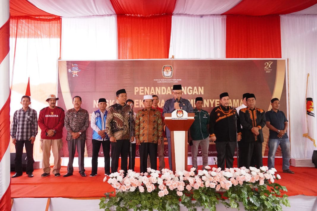 Ketua KIP Gayo Lues dan 2 Paslon Bupati dan Wakil Bupati Gayo Lues beserta partai-partai Pendukung di acara Deklarasi Pemilu Damai di halaman Kantor KIP Gayo Lues Selasa (24/9/2024). Berita Sore/Muhammad Iqbal.