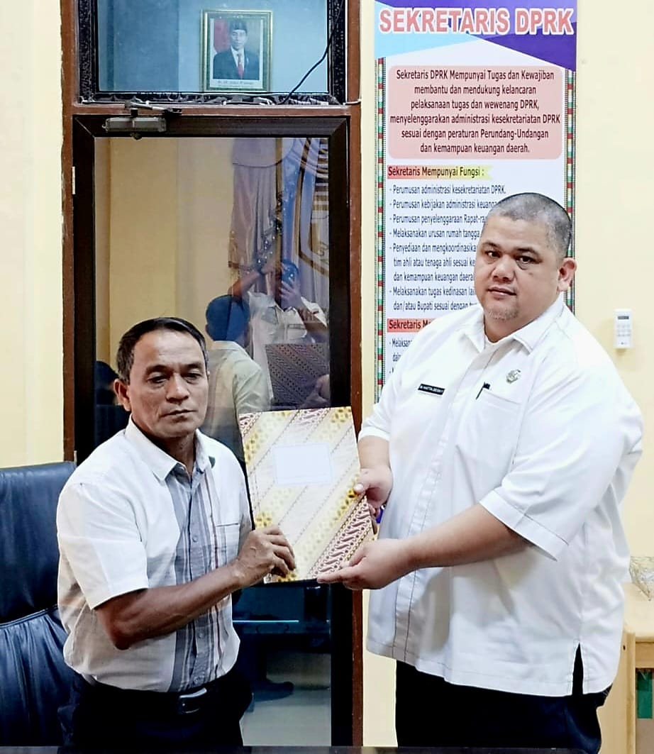 KUTACANE (Berita) : Sekertaris Dewan Perwakilan Rakyat Kabupaten Aceh Tenggara M Hatta Desky Rabu sore (27/3), telah menyerahkan berkas 11 Nama yang lulus Verifikasi Administrasi pansel Penjaringan dan Penyaringan Anggota Panwaslih 2024 Kepada Ketua Komisi A.