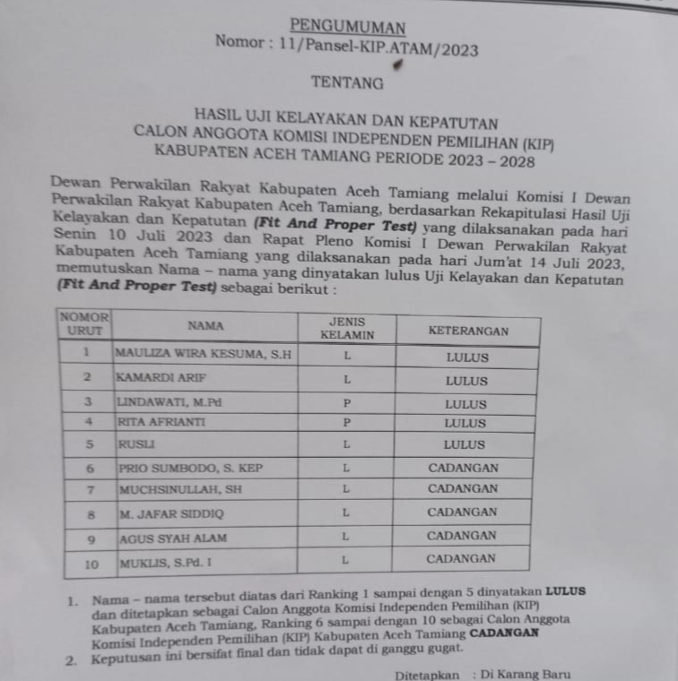 Kemudian dalam surat pengumuman poin satu menyatakan nama – nama tersebut diatas dari Rangking 1 sampai 5 dinyatakan LULUS dan ditetapkan sebagai Calon Komisi Independen Pemilihan (KIP) Kabupaten Aceh Tamiang. Rangking 6 sampai 10 dinyatakan CADANGAN Calon Komisi Independen Pemilihan (KIP) Kabupaten Aceh Tamiang. Poin dua menyatakan keputusan ini betsifat final dan tidak dapat diganggu gugat.