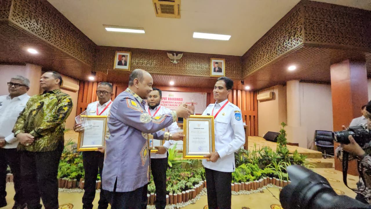 Penghargaan diserahkan Pj gubernur Aceh Bustami SE., MSi didampingi Dirjen Bina Pemerintahan Desa Kemendagri kepada Pj Walikota Langsa Syaridin SPd.l, MPd pada rapat koordinasi penguatan pemerintahan Gampong se-Aceh tahun 2024 di gedung Serbaguna Sekretariat Daerah Aceh, Jum’at (5/7/2024).