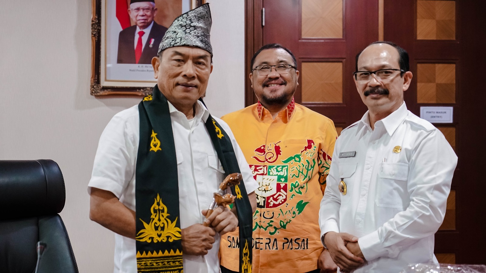 Pejabat (Pj) Bupati Aceh Tamiang, Dr. Drs. Meurah Budiman, SH, MH, menyerahkan Tumbak Lada yang menjadi senjata khas daerah. Selain itu, turut dipasangkan Tengkulok dan selempang motif songket Tamiang kepada Moeldoko. beritasore/Ist