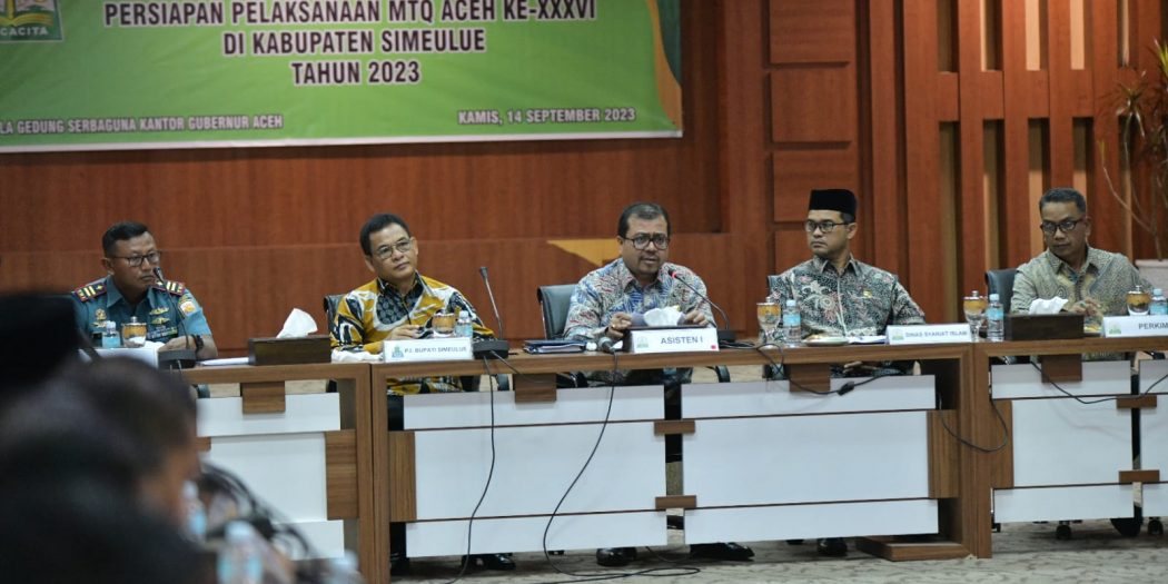 BANDA ACEH (Berita): Pemerintah Aceh dan Pemerintah Kabupaten (Pemkab) Simeulue menggelar rapat bersama untuk membahas persiapan pelaksanaan Musabaqah Tilawatil Quran (MTQ) Aceh ke-36, di Gedung Serbaguna Kantor Gubernur Aceh, Kamis, (14/9).