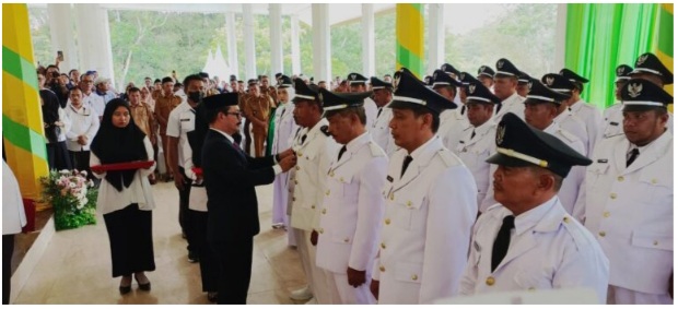 Teks foto : Pj Bupati Aceh Tamiang, Meurah Budiman saat melantik 39 datok Penghulu, Acara berlangsung di Tribun lapangan kantor bupati setempat, Rabu (18/10).