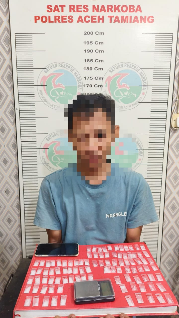 KUALASIMPANG (Berita): Tim Opsnal Satuan Reserse Narkoba (Satresnarkoba) Polres Aceh Tamiang berhasil menangkap seorang pengedar narkoba jenis sabu di Dusun Mawar, Desa Bukit Rata, Kecamatan Kejuruan Muda, Kabupaten Aceh Tamiang, Minggu (13/10/2024).