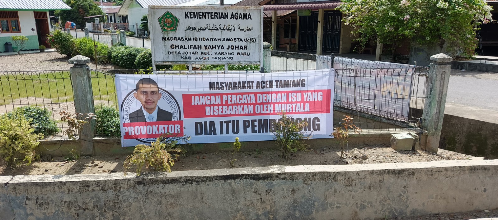 Spanduk yang terpasang di pagar Madrasah Ibtidaiyah Swasta (MIS) Chalifah Yahya Johar jalan Lintas Medan – Banda Aceh Kampung Johar Kecamatan Karang Baru Kabupaten Aceh Tamiang tersebut bertuliskan “Masyarakat Aceh Tamiang Jangan Percaya Dengan Isu Yang Disebarkan Oleh Murtala. Dia Itu Pembohong”.