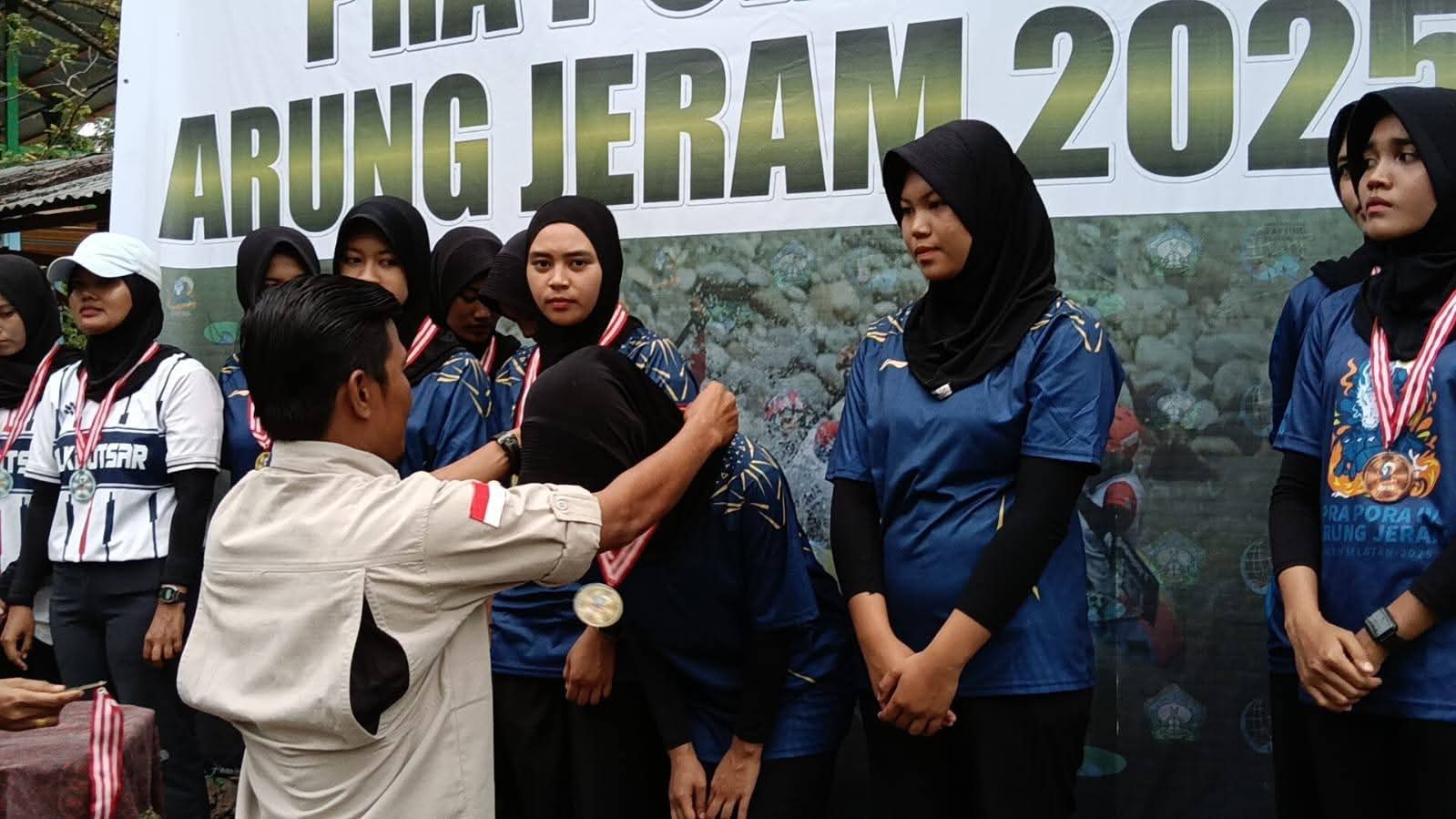 Pajriansyah, Ketua FAJI Agara tengah mengalungkan mendali kepada Tim Putri dalam ajang Prapora Cabor Arung Jeram di Sungai Gunung Sampali Kluet Tengah Kabupaten Aceh Selatan Senin (17/11/2025). Berita Sore/Ist.