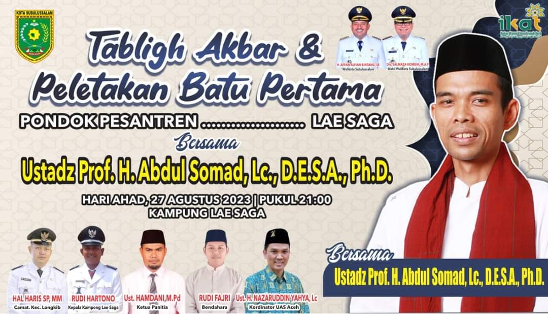 Subulussalam (Berita): Ustadz H. Abdul Somad dijadwalkan tabligh akbar di Kampong Lae Saga, Kecamatan Longkib, Subulussalam, Minggu (27/8) sekira pukul 21.00 – 22.30 WIB.