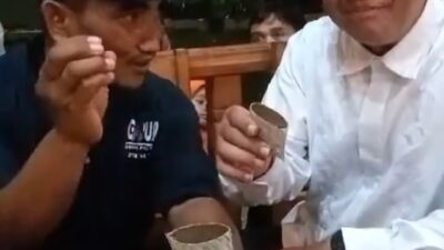 Setelah dibuka, sepotong alame dimakan Capres RI ini, yang dia rasakan manis, yang terbuat dari gula aren asli Mandailing Natal. Tanpa pangawet.