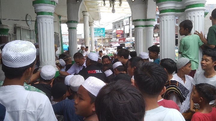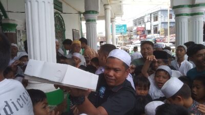 Warga “serbu” pengurus SMSI Madina saat membagikan nasi kotak usai salat Jumat di dua masjid di Panyabungan.