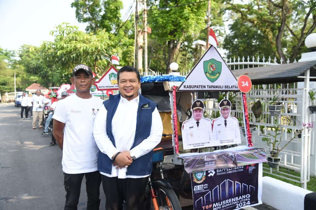 TAPSEL (Berita): Bupati Tapanuli Selatan (Tapsel) H Dolly Pasaribu naik Becak Motor (Betor) bersama peserta lainnya menuju Santika Premiere Dyandra Convention Center Hotel tempat pelaksanaan Musyawarah Perencanaan Pembangunan RKPD Provinsi Sumatera Utara (Provsu) 2024, Rabu (12/4).
