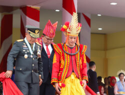 Wakil Gubernur Sumatera Utara Musa Rajekshah menakan Baju Adat Nias Selatan dalam upacara HUT RI ke-78, di Lapangan Astaka, Jalan William Iskandar, Deli Serdang, Kamis (17/8).