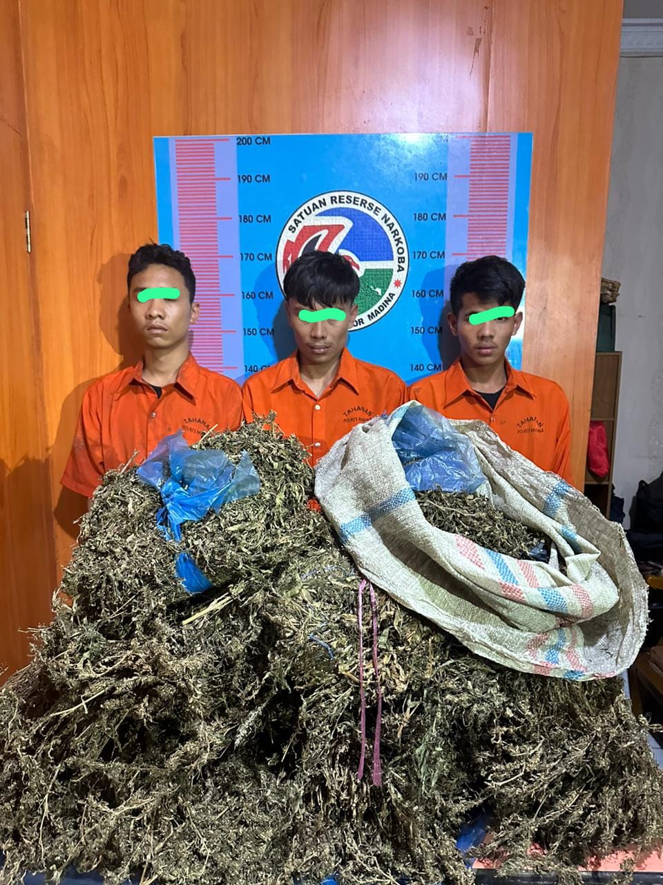 MADINA (Berita): Ibarat film laga, polisi dari Satnarkoba Polres Madina menangkap tiga tersangka (TSK) dan mengamankan barang bukti di jalanan saat bawa ganja.