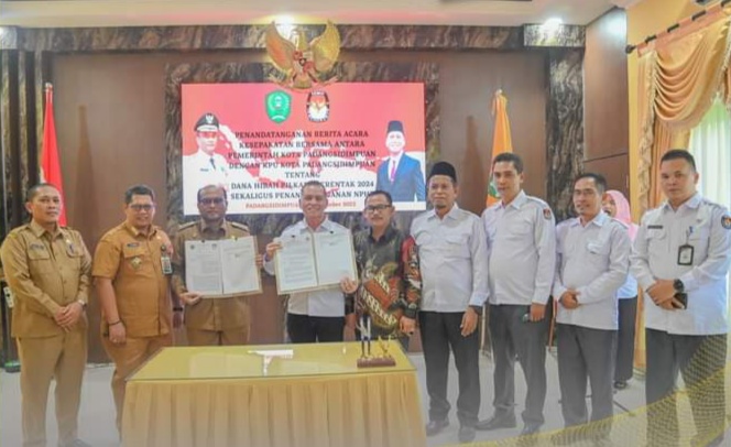 PADANGSIDIMPUAN (Berita): Komisi Pemilihan Umum (KPU) dengan Pemerintah Kota Padangsidimpuan menandatangani Naskah Perjanjian Hibah Daerah (NPHD) Pilkada 2024.