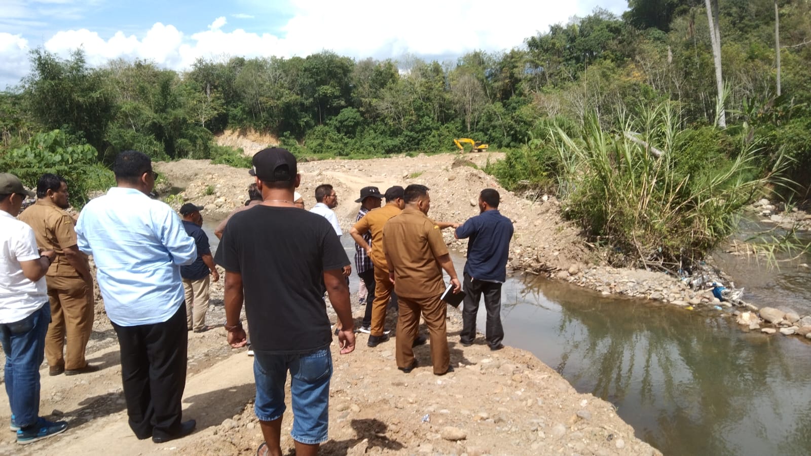 Anggota DPRD Madina melakukan peninjauan ke lokasi tanggul berdekatan langsung dengan area pengambilan material tanpa izin galian C di daerah aliran sungai (DAS) Aeksimalagi.
