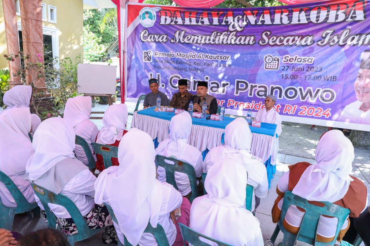 Deli Serdang (Berita): Sukarelawan Tuan Guru Sahabat (TGS) Ganjar Pranowo bersama Remaja Masjid Al Kautsar, melaksanakan penyuluhan bahaya narkoba dan cara memulihkan secara Islami di Desa Binjai Bakung, Kecamatan Pantai Labu, Kabupaten Deli Serdang, Sumatera Utara.