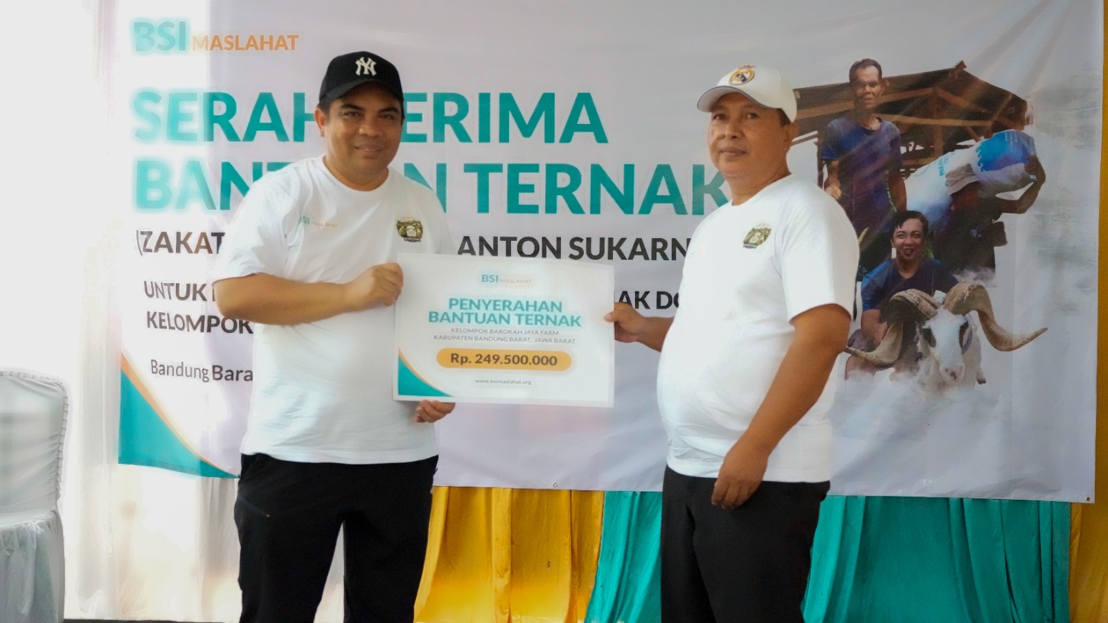 BANDUNG (Berita): BSI Maslahat menyerahkan bantuan zakat muqayyad berupa ternak domba senilai Rp249,500 juta kepada masyarakat Desa Jati Mekar, Kabupaten Bandung Barat, sebagai bagian dari program pemberdayaan ekonomi Masyarakat berkelanjutan.