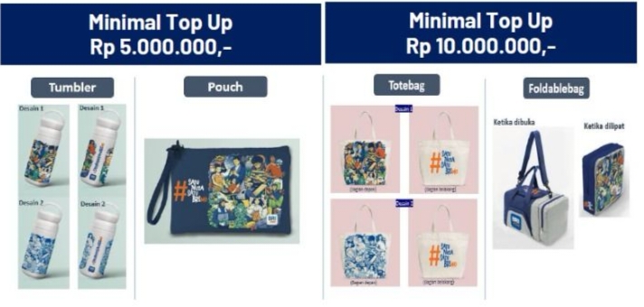 “Untuk nasabah minimal Top up Dana Rp Rp5.000.000, berkesempatan mendapatkan hadiah reward dalam bentuk barang, seperti Tumbler dan Pouch, sementara untuk nasabah minimal Top up Dana Rp10.000.000, akan mendapatkan Reward, Totebag dan Foldablebag,” jelas Rian Darmawan.