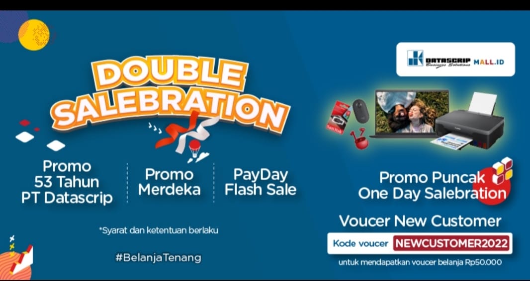 JAKARTA (Berita): Dalam rangka merayakan ulang tahun yang ke-2, DatascripMall.ID menghadirkan promo bertajuk Double Salebration #BelanjaTenang. Para pelanggan memiliki kesempatan menikmati berbagai promo mulai dari Promo Double Salebration, Promo Merdeka, Promo Puncak One Day Salebration, Payday Flash Sale untuk berbagai produk hingga voucer khusus untuk pelanggan baru di periode bulan Agustus 2022.
