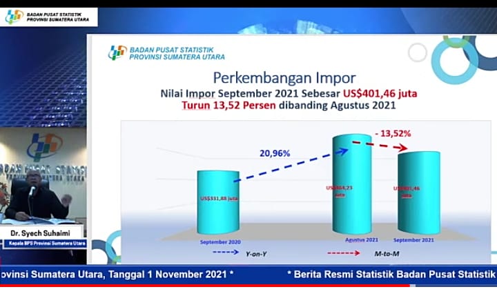 Sementara itu nilai impor melalui Sumatera Utara bulan September 2021 atas dasar CIF (cost, insurance & freight) sebesar 401,46 juta dolar AS juga turun sebesar 13,52 persen dibandingkan bulan Agustus 2021 yang mencapai 464,23 juta dolar AS.