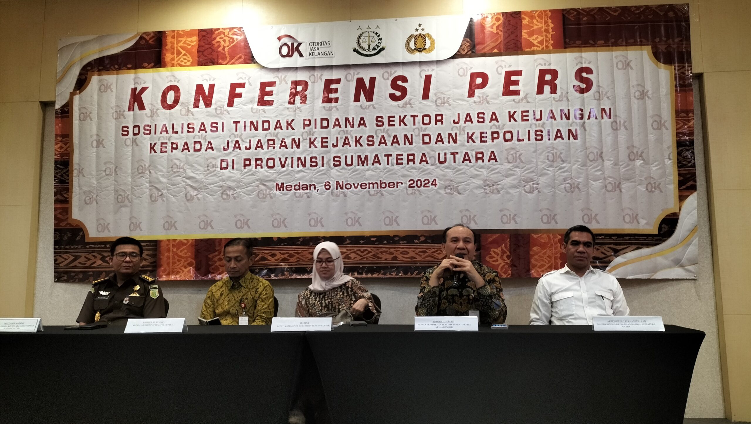 Dari kiri ke kanan: Asisten Pidana Khusus Kejaksaan Tinggi Sumut Muttaqien Harahap, Kepala OJK Sumut Khoirul Muttaqien, Deputi Komisioner Hukum dan Penyidikan OJK Yuliana, Kepala Departemen Penyidikan Sektor Jasa Keuangan OJK Tongan L Tobing dan Wadirkrimsus Kepolisian Daerah Sumut AKBP Jose DC Fernandes, SIK berbicara kepada wartawan di sela sosialisasi Tindak Pidana Sektor Jasa Keuangan di hotel Four Points Sheraton Jalan Gatot Subroto Medan Rabu (6/11/2024). Berita Sore/laswie wakid