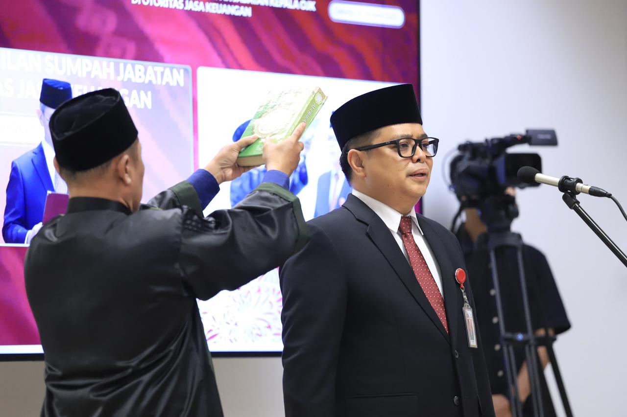 JAKARTA (Berita): Ketua Dewan Komisioner Otoritas Jasa Keuangan (OJK) Mahendra Siregar melantik dan mengambil sumpah jabatan Adi Surahmat sebagai Kepala Kantor OJK Provinsi Maluku Utara dalam acara yang berlangsung di Kantor OJK, Gedung Wisma Mulia, Jakarta, Jumat (10/10/2025).