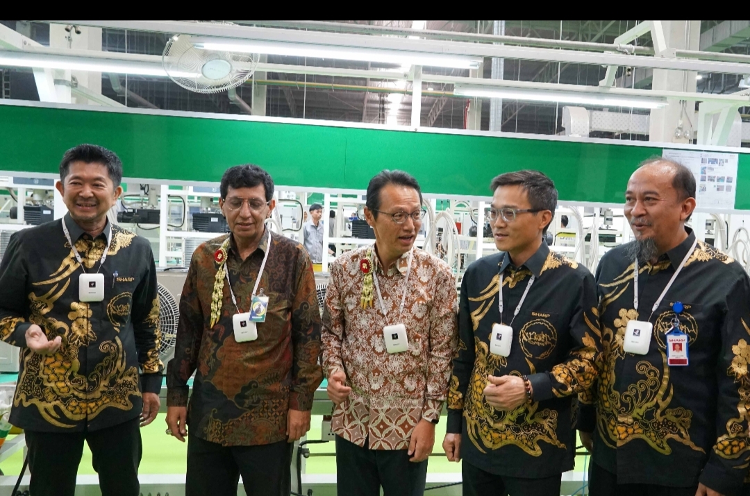Berita Sore/ist Dari kiri ke kanan: Shinji Teraoka, Presiden Direktur, PT Sharp Electronics Indonesia, Taufik Bawazier, Direktorat Jenderal Industri Logam, Mesin, Transportasi dan Elektronika (ILMATE), Kenji Kanasugi, Dubes Jepang untuk Indonesia, Robert Wu, President & CEO, PT Sharp Electronics Indonesia dan Andry Adi Utomo, National Sales Senior GM , PT Sharp Electronics Indonesia saat factory tour di kawasan Karawang International Industrial City (KIIC), Karawang, Jabar Rabu (23/8).