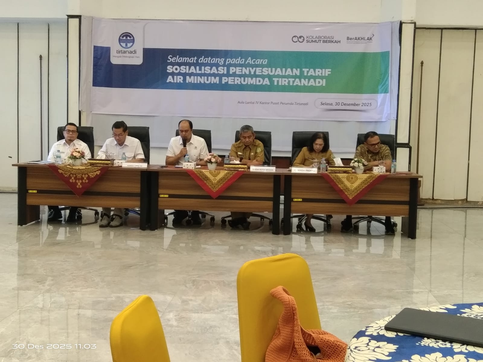MEDAN (beritasore.co.id): Perusahaan Umum Daerah (Perumda) Tirtanadi Provinsi Sumatera Utara melakukan sosialisasi penyesuaian tarif air kepada masyarakat di Kantor Pusat Perumda Tirtanadi, Jalan Sisingamangaraja No 1 Medan, Selasa (30/12/2025).