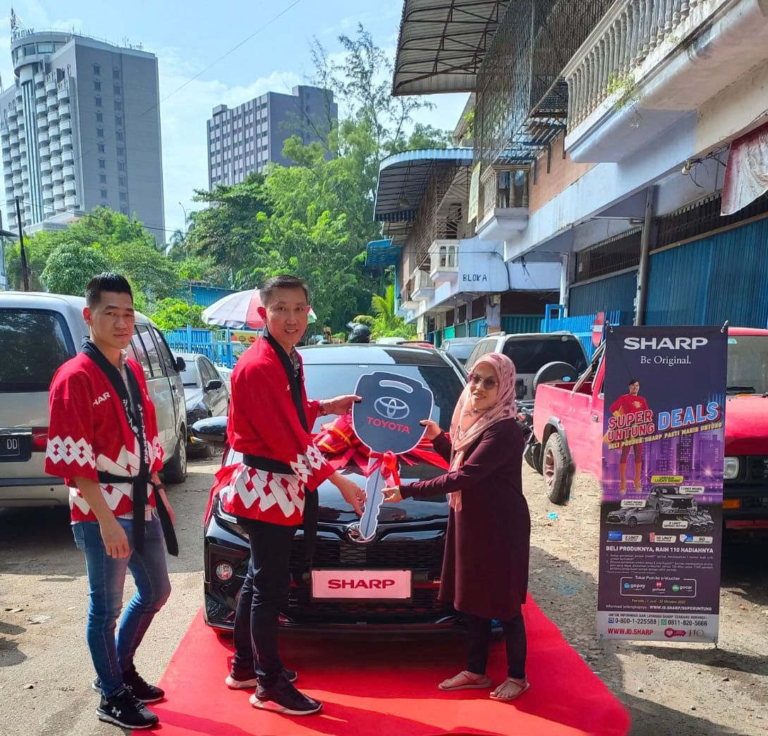 Perwakilan Sharp Indonesia Suwandi Branch Manager Medan, PT Sharp Electronics Indonesia dan Sufyan, Coordinator Manager, PT Sharp Electronics Indonesia menyerahkan hadiah 1 unit mobil Agya kepada Mistazuriani pada 22 Februari 2023.