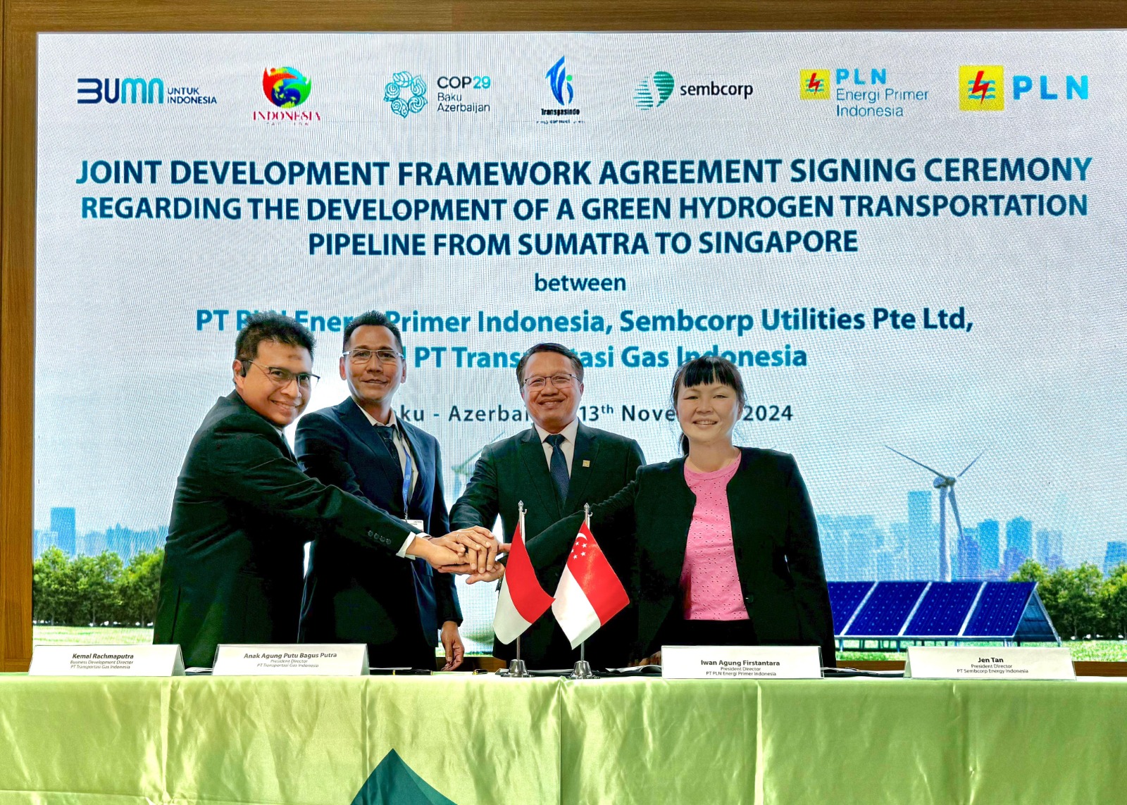 JAKARTA (Berita): PT Transportasi Gas Indonesia (PT TGI), Sembcorp Utilities Pte Ltd (Sembcorp), dan PT PLN Energi Primer Indonesia (PT PLN EPI) menandatangani Joint Development Framework Agreement (JDFA) pada tanggal 13 November 2024 di COP29 Baku, Azerbaijan.