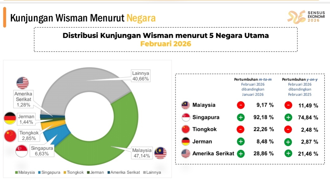 Namun pada Pebruari 2026 dibanding Januari 2026, kunjungan wisman dari Singapura ke Sumut tumbuh 92,18 persen. Disusul wisman dari Amerika Serikat 28,86 persen, Tiongkok 22,26 persen, Malaysia 9,17 persen dan Jerman 8,48 persen.