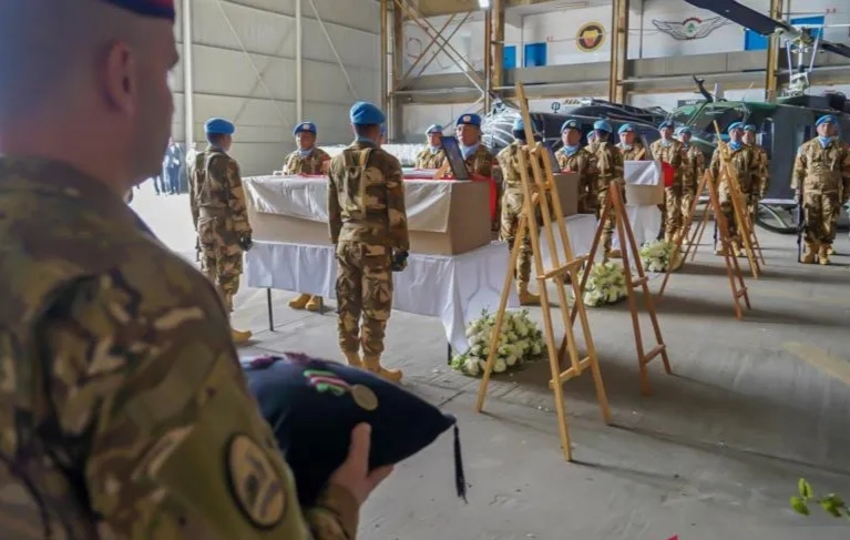 Suasana upacara pelepasan dan penghormatan tiga jenazah personel penjaga perdamaian Indonesia yang tergabung dalam misi United Nations Interim Force in Lebanon (UNIFIL) di Hanggar Lebanese Air Force, Beirut Lebanon, Kamis (2/4/2026). UNIFIL menyelenggarakan upacara Memorial Service sebagai bentuk penghormatan terakhir kepada tiga prajurit TNI yang gugur dalam misi perdamaian dunia di Lebanon Selatan, sebelum dipulangkan ke tanah air. (ant/KBRI Lebanon)