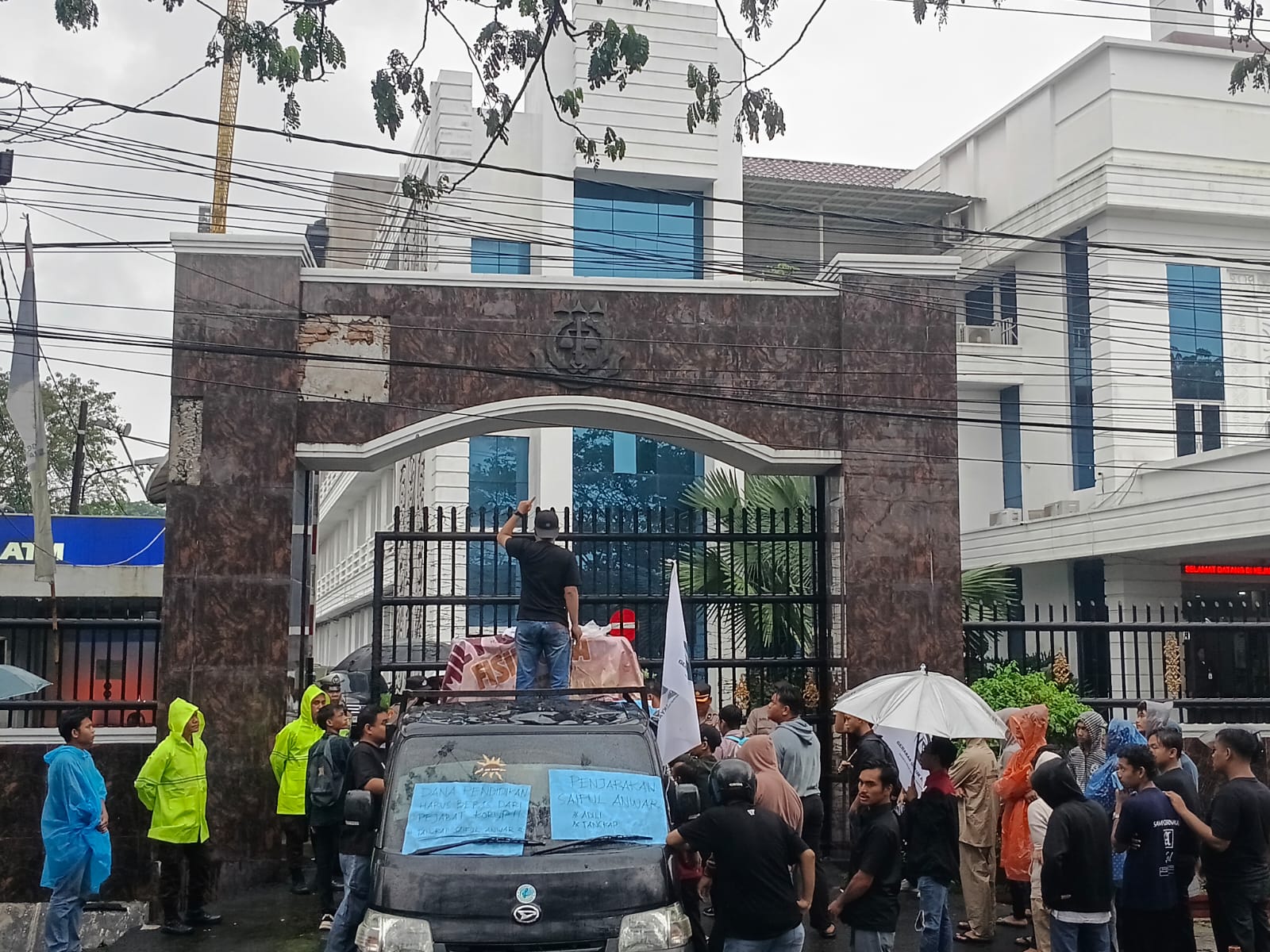Secara bergantian, massa aksi menyampaikan orasi di bawah guyuran hujan. Mahasiswa menegaskan bahwa dugaan penyelewengan dana bantuan pendidikan merupakan persoalan serius yang tidak hanya merugikan keuangan negara, tetapi juga berdampak langsung pada masa depan mahasiswa dari keluarga kurang mampu.