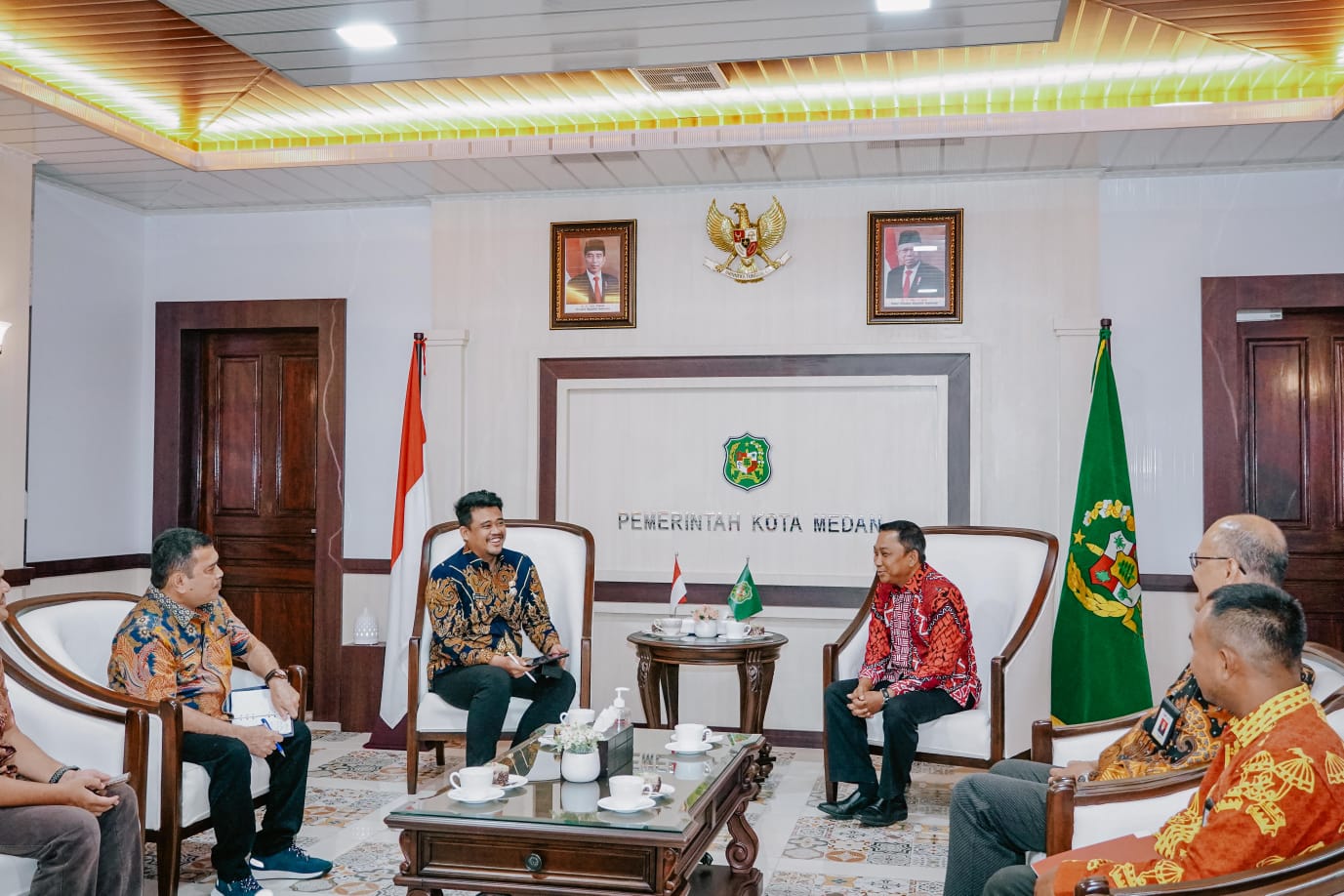 MEDAN (Berita): Penguatan digitalisasi keuangan kepada masyarakat, khususnya pelaku UMKM menjadi inti pesan yang disampaikan Wali Kota Medan Bobby Nasution saat menerima kedatangan Kepala Otoritas Jasa Keuangan (OJK) Regional 5 Sumatera Bagian Utara (Sumbagut) Bambang Mukti Riyadi di Balai Kota Medan, Kamis (4/5) sore.