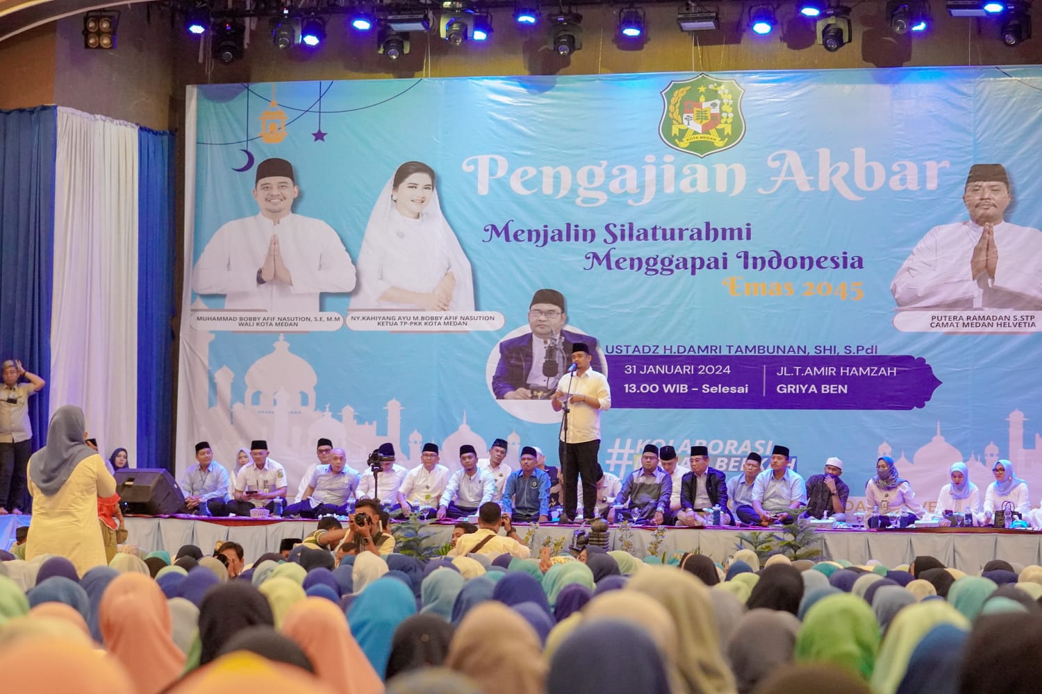 “Kami yakin di antara doa yang ibu panjatkan, ada doa untuk kami (Pemko Medan). Atas doa-doa ibu lah kami bisa melaksanakan tugas-tugas dengan baik. Mudah-mudahan membawa kebaikan dunia dan akhirat,” kata Bobby Nasution di Pengajian Akbar Kecamatan Medan Barat dan Medan Helvetia di Gedung Griya Ben, Jalan T Amir Hamzah Medan, Rabu (31/1/2024) sore.