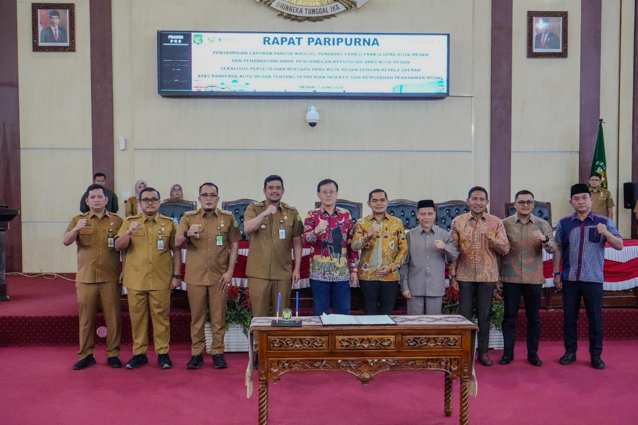 Persetujuan ini ditandai dengan Penandatanganan/Pengambilan Keputusan DPRD Kota Medan sekaligus Persetujuan Bersama DPRD Kota Medan dengan Kepala Daerah atas Ranperda Kota Medan tentang Insentif dan Kemudahan Penanaman Modal oleh Wali Kota Medan Bobby Nasution dan Ketua DPRD Medan Hasyim SE di Gedung DPRD Medan, Senin (3/6/2024).
