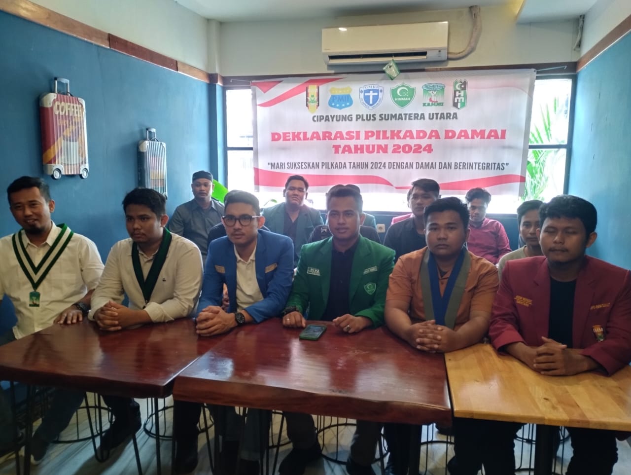 MEDAN (Berita): Sekelompok mahasiswa yang tergabung dalam Cipayung Plus Sumatera Utara mengajak seluruh mahasiswa generasi muda dan elemen masyarakat mewujudkan dan menjaga kekondusiftas Pilkada serentak 2024 di Sumatera Utara dan Kota Medan.