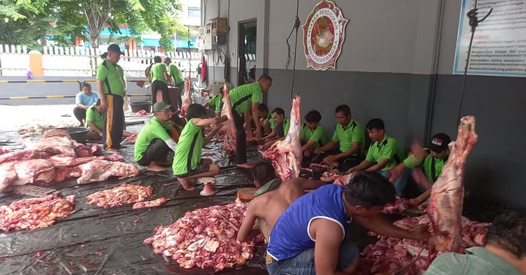 Suasana semangat kebersamaan saat proses pemotongan dan pendistribusian daging kurban di halaman Kampus Pascasarjana Gedung II Undhar, Jalan Yos Sudarso Medan.beritasore/ist