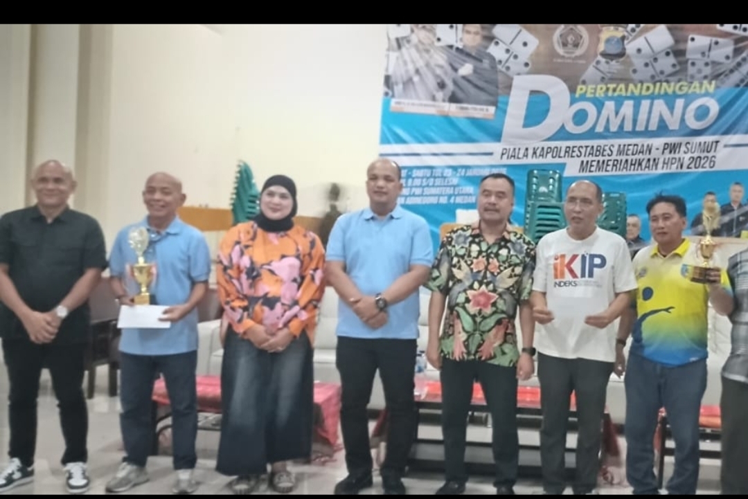 MEDAN (beritasore.co.id): Pertandingan domino PWI Sumut piala Kapolrestabes Medan berakhir dengan sukses, ditutup secara resmi oleh Kasat intelkam Polrestabes Medan AKBP Lengkap Suherman Siregar mewakili Kapolrestabes Medan Kombes Pol Dr. Jean Calvijn Simanjuntak, Sabtu (24/1/2026) di gedung PWI Sumut Jalan Adinegoro Medan.