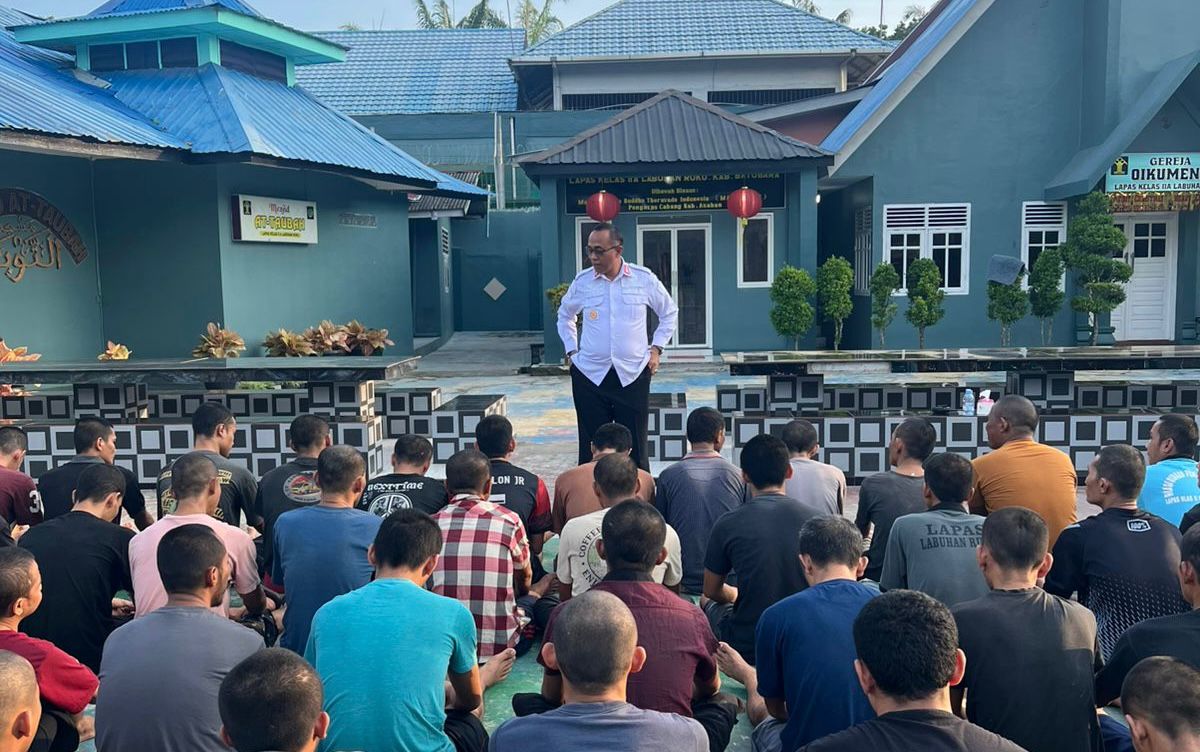 Kepala Lembaga Pemasyarakatan Kelas IIA Labuhan Ruku Soetopo Berutu memberikan pengarahan kepada tahanan yang sedang menjalani masa pengenalan lingkungan (Mapenaling) Senin (3/2/2025). Berita Sore/alirsyah