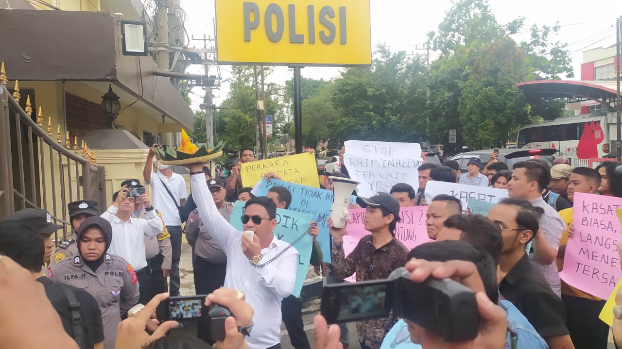 “Nasi tumpang ini sebagai apresiasi kita karena begitu cepatnya Polrestabes Medan dalam tempo 20 hari sudah bisa menetapkan tersangka dan menahan seseorang tanpa terlebih dahulu melakukan pemanggilan atau undangan klarifikasi,” sindir Dwi Ngai Sinaga SH MH selaku kuasa hukum Yossy Efrilia Susanti, yang turut bersama pendemo persis di depan pintu masuk Mapolrestabes Medan.
