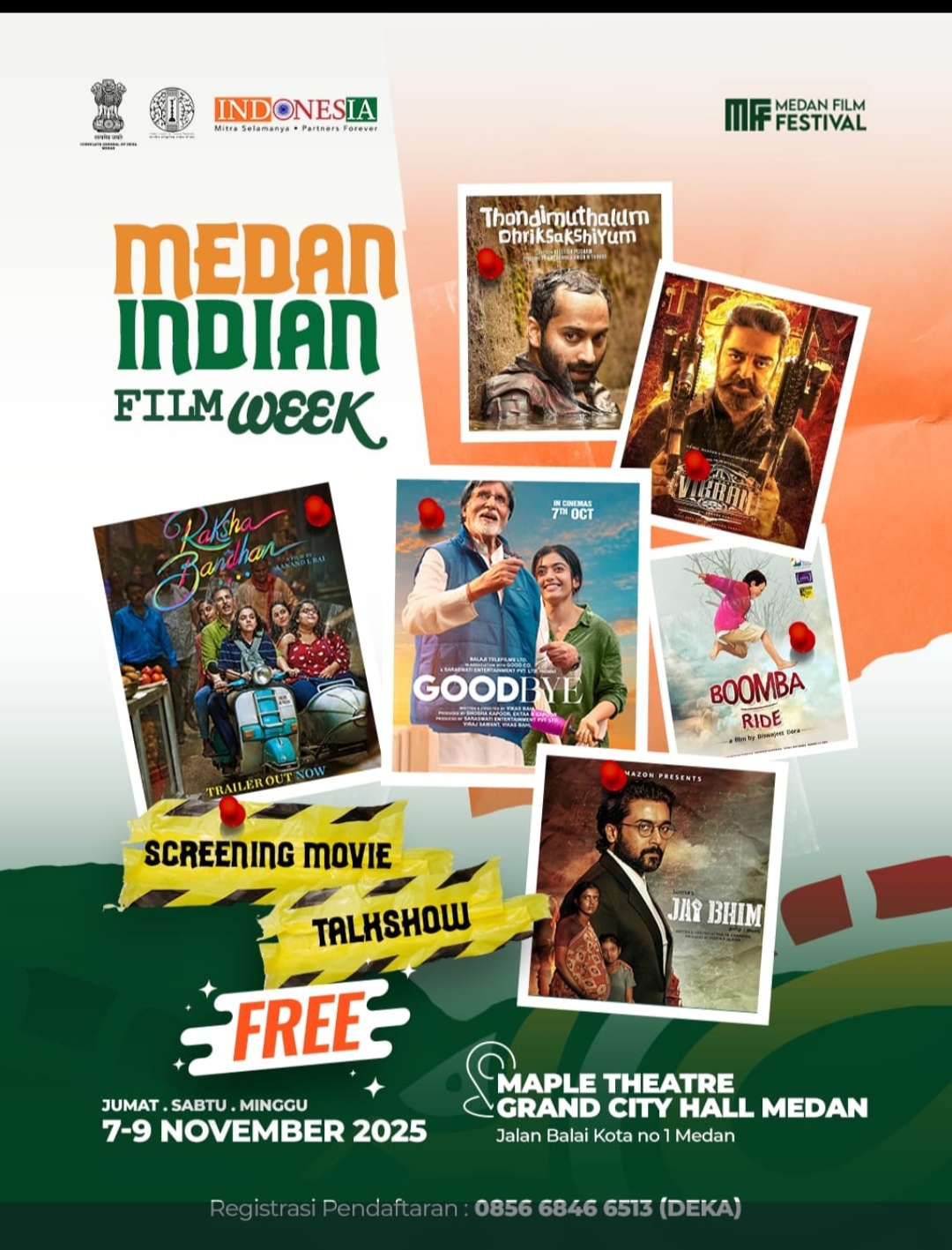MEDAN (Berita): Konsulat Jenderal India di Medan, bekerja sama dengan Medan Film Festival, menghadirkan Medan Indian Film Week untuk menampilkan film-film India yang diakui dari berbagai daerah dan bahasa di India.