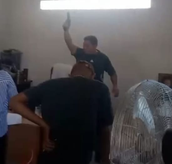 Selanjutnya pria itu sembari mengarahkan senpi ke para buruh untuk jangan coba-coba memvideokan aksinya. Dia mengaku terancam karena banyaknya orang di dalam ruangan. Senpi itu kemudian dimasukkan pria tersebut ke dalam laci. Di saat yang bersamaan tampak seorang wanita yang mengenakan hijab menghampiri pria itu untuk menenangkannya.